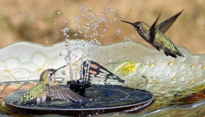 Hummingbirds don’t use birdbaths the way larger birds do. They prefer shallow water or fine mist.